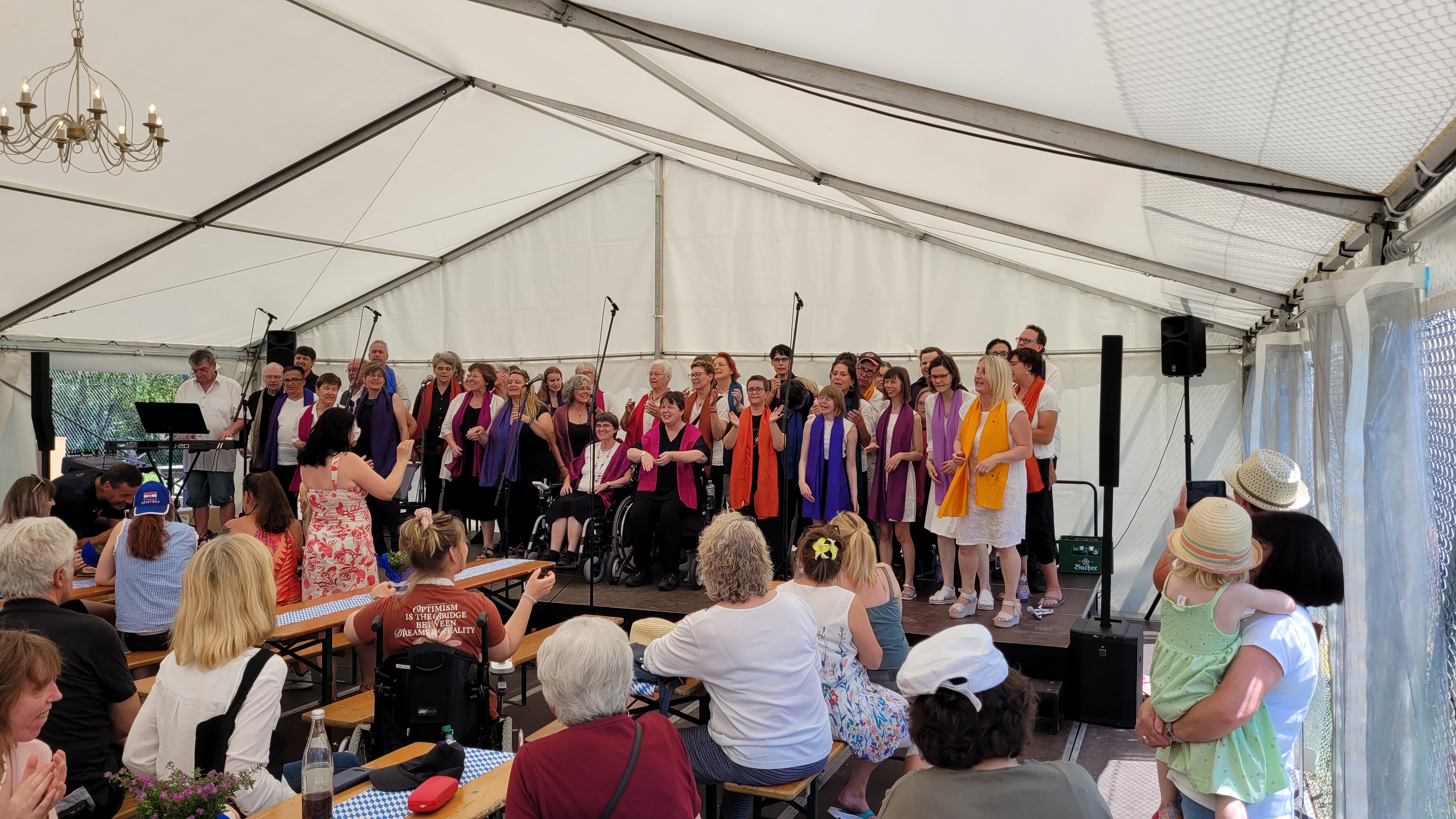 Wir durften die große, sehr schöne Feier am 6. Juli mitgestalten und haben unser vielfältiges musikalisches Repertoire im eigens aufgebauten Festzelt zum Besten gegeben. Inklusion soweit das Auge reicht - bei den Feiernden wie beim Chor steht die gelebte Inklusion im Vordergrund und wird aktiv umgesetzt. Das zeigt sich auch bei etlichen Mitwirkenden in unserem Chor, da sie gleichzeitig neben dem Chor auch in der Werkstatt aktiv tätig sind.