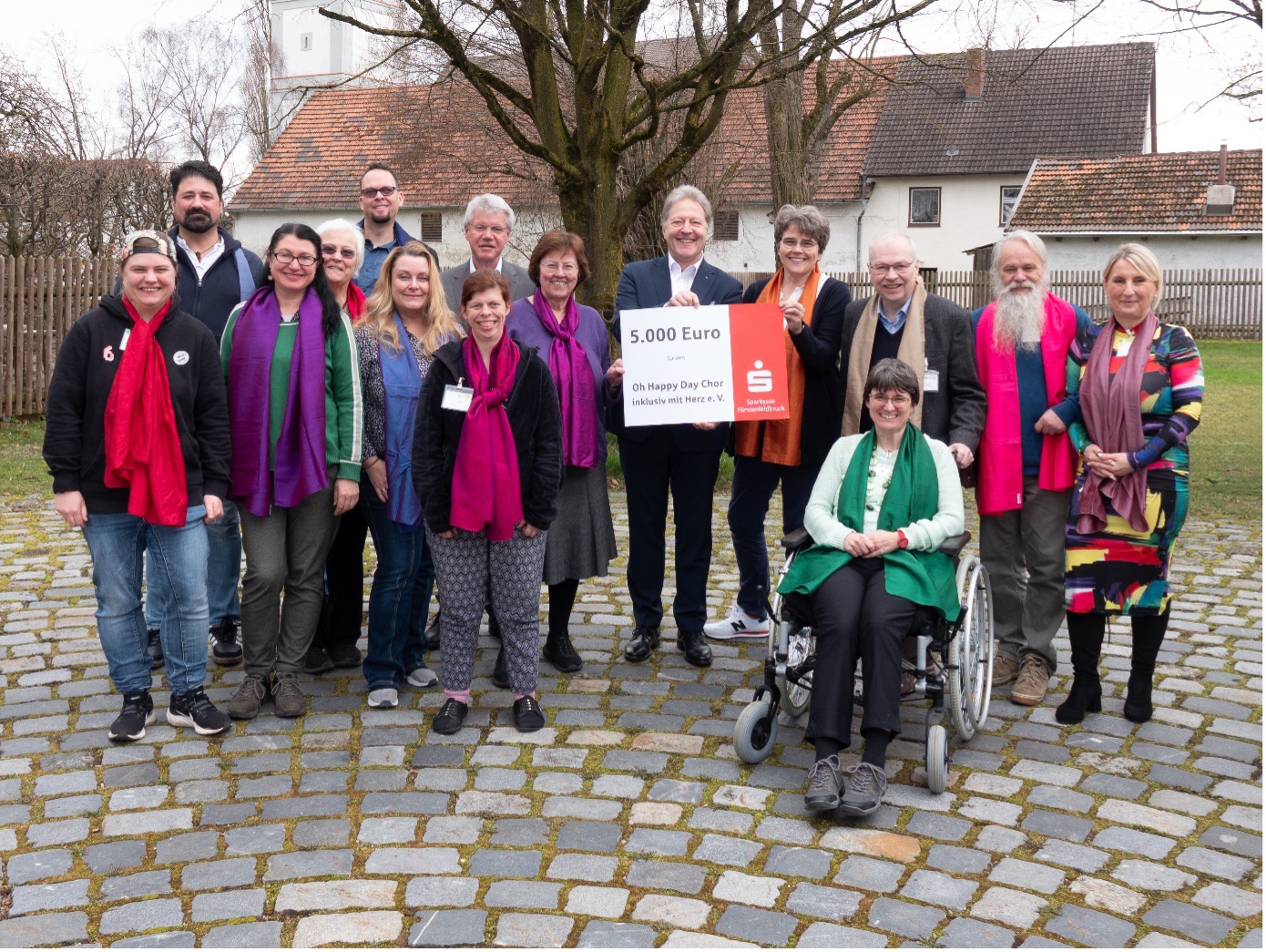 Um 11.00 Uhr am Sonntag klopfte es an die Türe, als der „Oh Happy Day Chor – inklusiv mit Herz e.V.“ seine Gesangsprobe in Mammendorf unterbrach. Großes Hallo – traten doch Herr Opitz (Vorsitzender des Vorstandes der Sparkasse Fürstenfeldbruck) und Herr Schachtner (stv. Vorsitzender des Vorstandes der Sparkassenstiftung) zu uns herein und nicht mit leeren Händen: Sie brachten einen großzügigen Scheck über 5.000.- € mit, um die Vorbereitungen der Auftrittsprojekte 2024 des inklusiven Gospelchores, bei dem Mitglieder mit und ohne Behinderung begeistert singen, zu unterstützen.