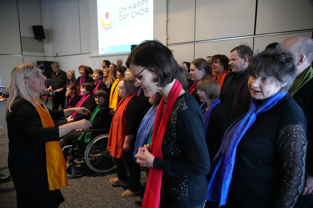 Den abendlichen Gospelschwung trugen wir gleich am nächstenTag weiter in den „internationalen Tag für Menschen mit Behinderung“, der am 1. Dezember nachmittags im Landratsamt veranstaltet wurde. Kleine Stationen wurden aufgebaut, Spiele, Glücksrad und kleine Snacks angeboten nach dem Motto - Jung und Alt, mit und ohne Behinderung – sollen hier zwanglos zusammenkommen und Spaß haben. Den Abschluss dieser Veranstaltung durften wir mit einem einstündigen Konzert gestalten. Nach unserem namensgebenden Einstiegssong „Oh happy Day“, gab es temperamentvolles, z.B „Go tell it on the Mountain“ oder„Rock my Soul“ wie auch nachdenkliches mit unserem Inklusionssong, den unser Pianist und Arrangeur Manfred Herrmann extra für uns geschrieben hat und natürlich viel weihnachtliches wie „Stern über Bethlehem, „Feliz Navidad“, „Merry Christmas“ und vieles mehr. Auch wenn wir gerne noch vor mehr Teilnehmern gesungen hätten: Die Besucher waren einmal mehr begeistert. Vielleicht ist das Event noch etwas neu und braucht noch Zeit, um bekannter zu werden. Mit Zugabe verabschiedeten wir uns in Freude und hochweihnachtlicher Stimmung in den tief verschneiten Abend.
